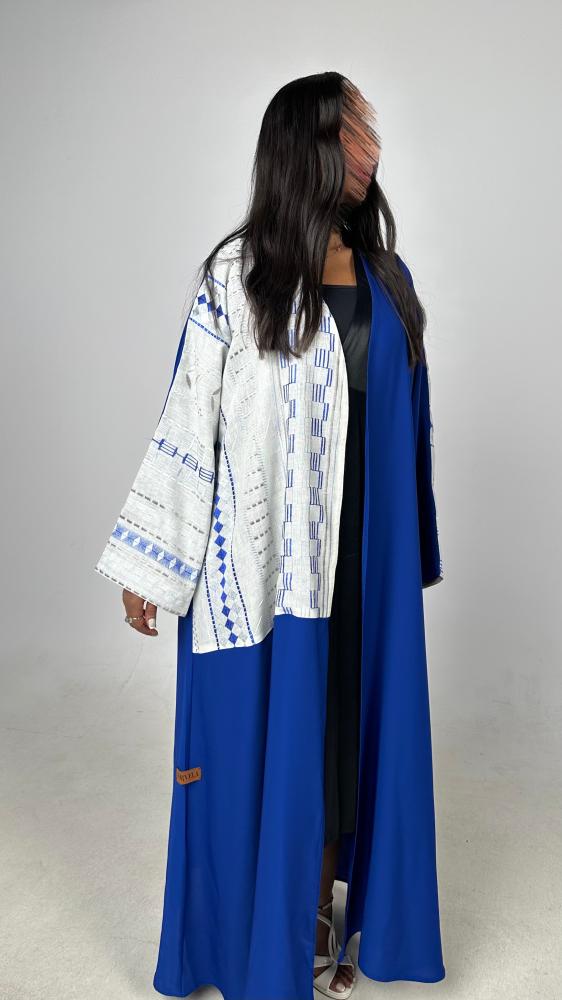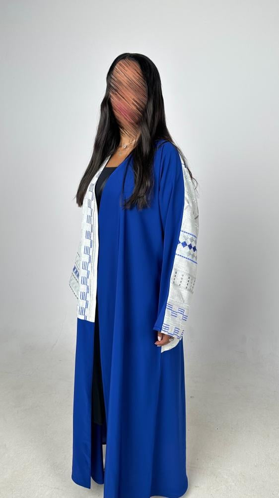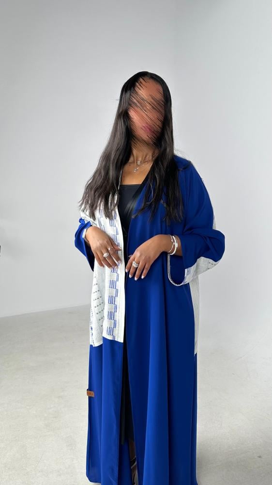 عبايات ازرق مصنوعة من قماش الكريب الياباني مع قطعة مطرزة في الأمام والخلف تضفي لمسة فنية راقية. تأتي بتصميم لف وقصة ربع كلوش أنيقة، مع طرحة نيلي مزينة بطرف أبيض متناسق لإكمال الإطلالة بأناقة مميزة.